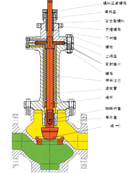 氣動(dòng)波紋管密封調(diào)節(jié)閥就是在密封元件外面加了一層保護(hù)膜,防止帶腐蝕性的介質(zhì)直接接觸密封元件,而且在介質(zhì)壓力增大時(shí),波紋管隨之伸長(zhǎng),降低介質(zhì)對(duì)密封面造成沖擊,在腐蝕性很強(qiáng)的介質(zhì)工況下,還可以采用雙波紋管結(jié)構(gòu)密封。